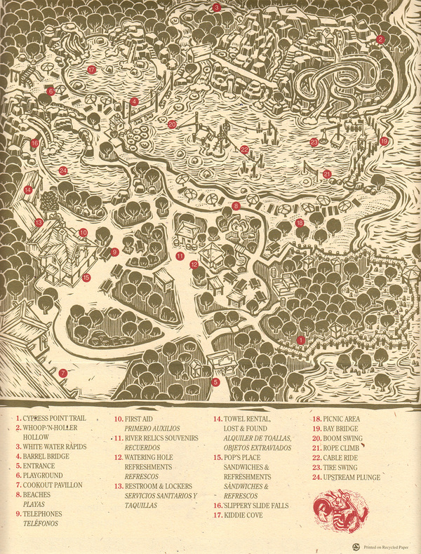 "Страна Рек(River Country) - самаое брызгательное, детско-смешное, скользительно-горочное, плото-переправлятельное, на веревке-качательное, ласточко-прыгательное, лето-плавательное, солнце-загорательное, пикничное, старомодное, хорошее, чистое и мокрое американское веселье, которое у вас когда-либо было!"