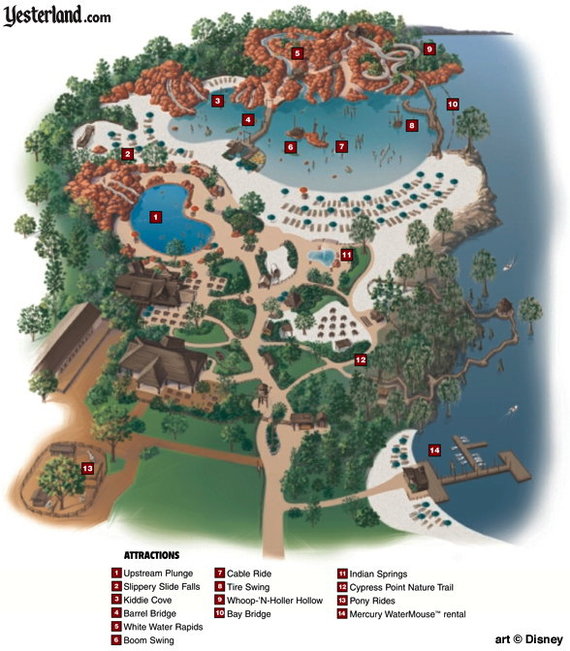 Ложные камни смешаны в парке с реальной галькой из рудников Джорджии и Каролины. Гостей также ждали настоящие песчаные пляжи, что создавало абсолютное ощущение единения с природой. В строительстве конструкций принимали участие и дисннеевские чиновники первого уровня: вице-президент Дик Нунис стал испытателем горок. Он же консультировал инженеров и указывал им на углы, которые надо смягчить, чтобы клиенты не вылетали за края, как это было с ним.