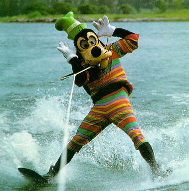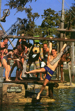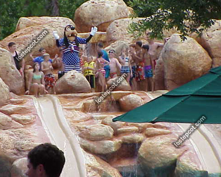 Гуфи был главным маскотом в Стране Рек, и он действительно катался на горках весь день, в тяжелом костюме и плавках. Вот это был действительно хороший пловец!