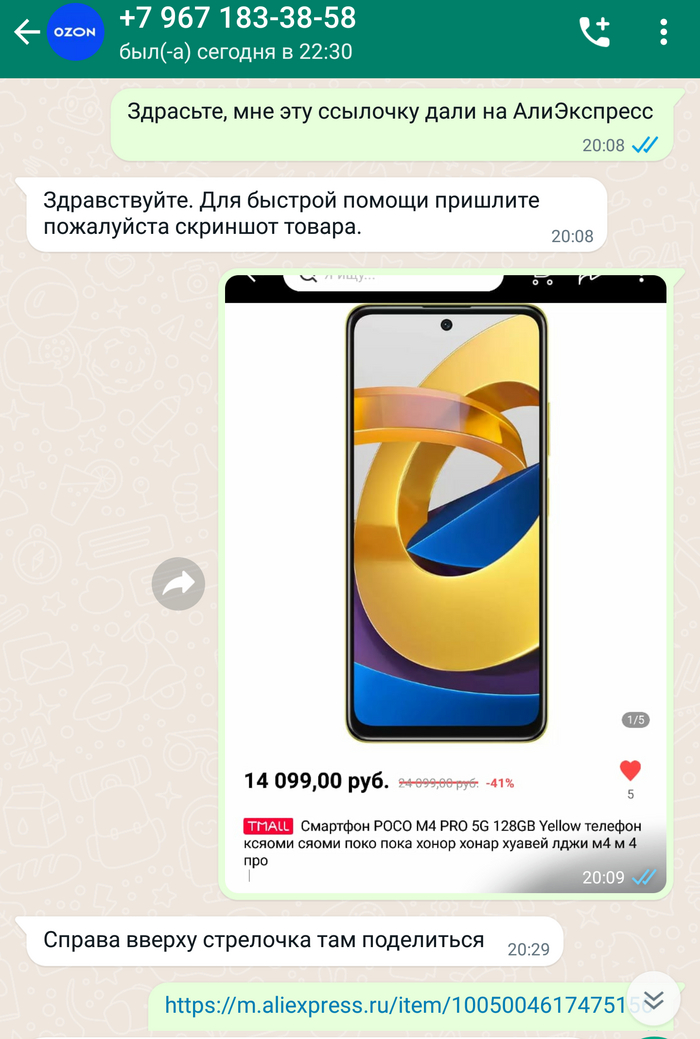 Товар на Али у них закончился, но есть на Озон (очень интересно). Ссылка не на товар с озона, а на контакт в ватсапп.. Дальше схема классическая.