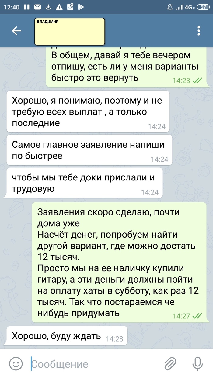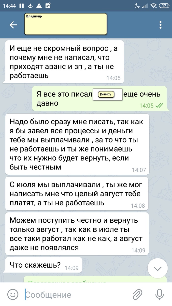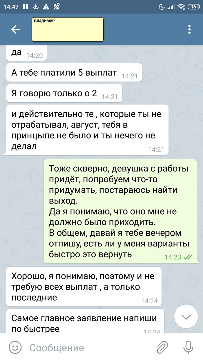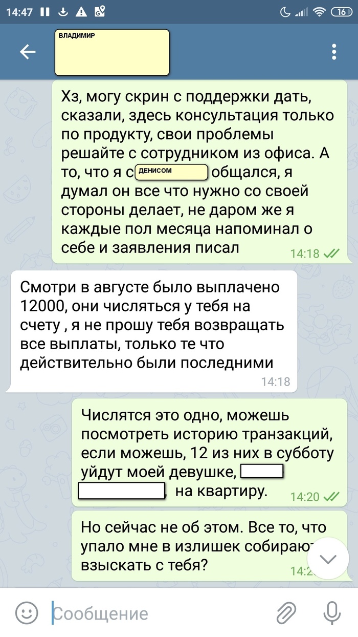 Из этого назревает вопрос, могут ли с меня законным образом потребовать эти деньги? Почитал статью 137 ТК РФ, но мне, как не юристу, тяжеловато верно интерпретировать написанное. Ещё Владимир вроде и хотел решить вопрос по-человечески, при этом намеренно врёт, хотя бы в том, что скидывает вину на Дениса, мол, тот ничего не присылал, я не в куrсе. А какая у меня мотивация верить ему в остальном? Где доказательства того, что с него действительно хотят взыскать выплаченные мне деньги, вдруг он врёт? Где гарантия, что, если я сейчас ему переведу 12 тысяч, с меня потом не решат взыскать всю сумму на законном основании, а там чуть более 28 тысяч. Надо думать.