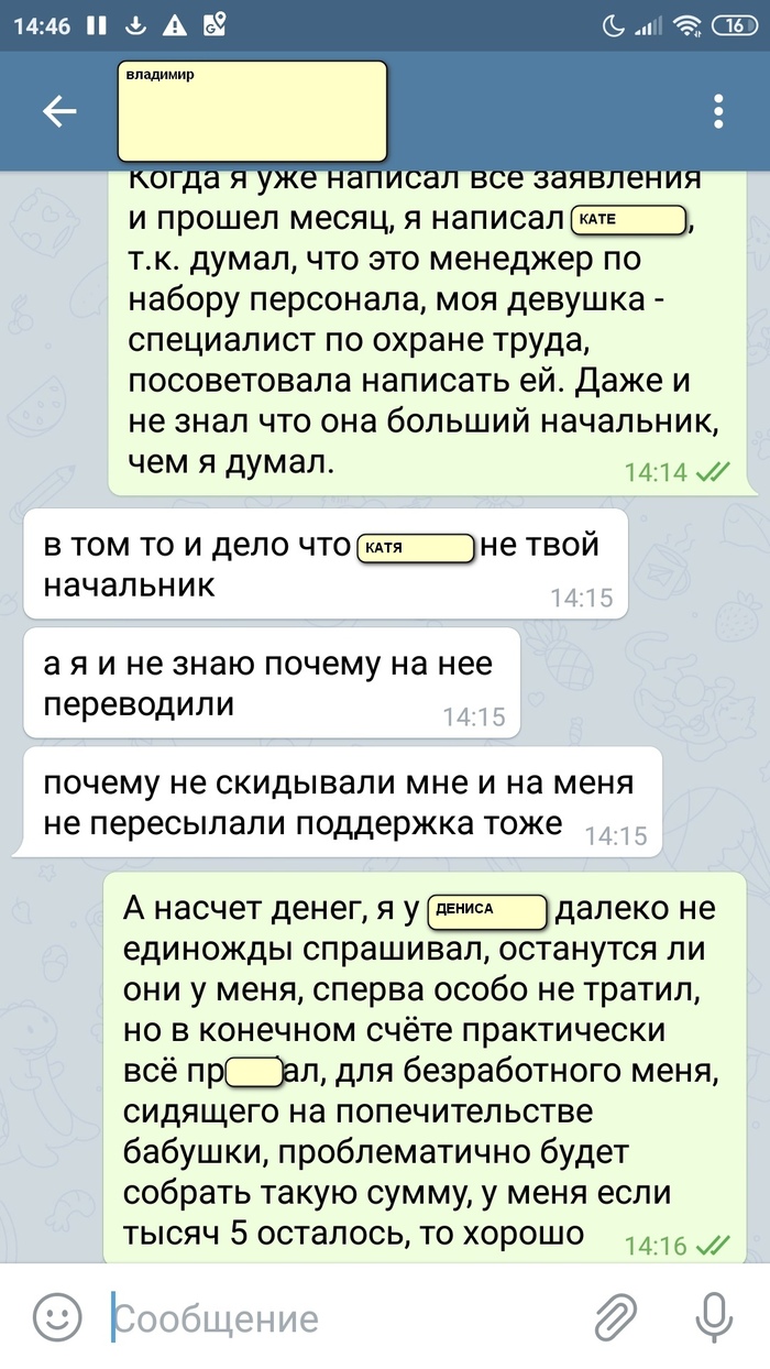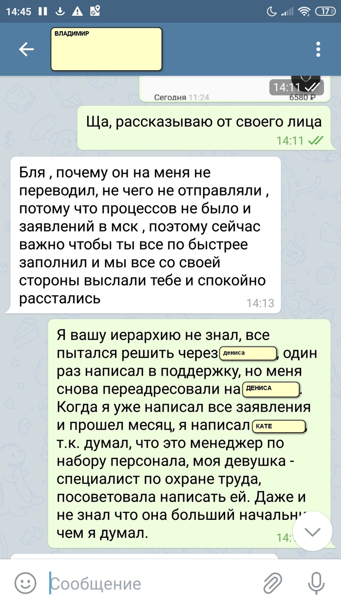 В начале сентября приходит очередная ЗП, о чём сообщаю Денису. С его стороны особой реакции нет. 13 Сентября Снова приходит ЗП, понимаю, что надо пообщаться с руководством без посредников, ибо слишком всё уже затянулось. Написал Кате, это, как я понял, ранее был какой-то региональный руководитель. Сейчас же, у нас другой региональный руководитель, Владимир. А Катя - руководитель по московской области (Как мне объяснили в офисе). Написал я Кате следующее: