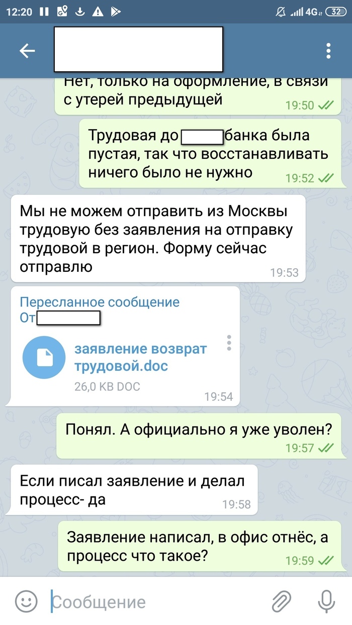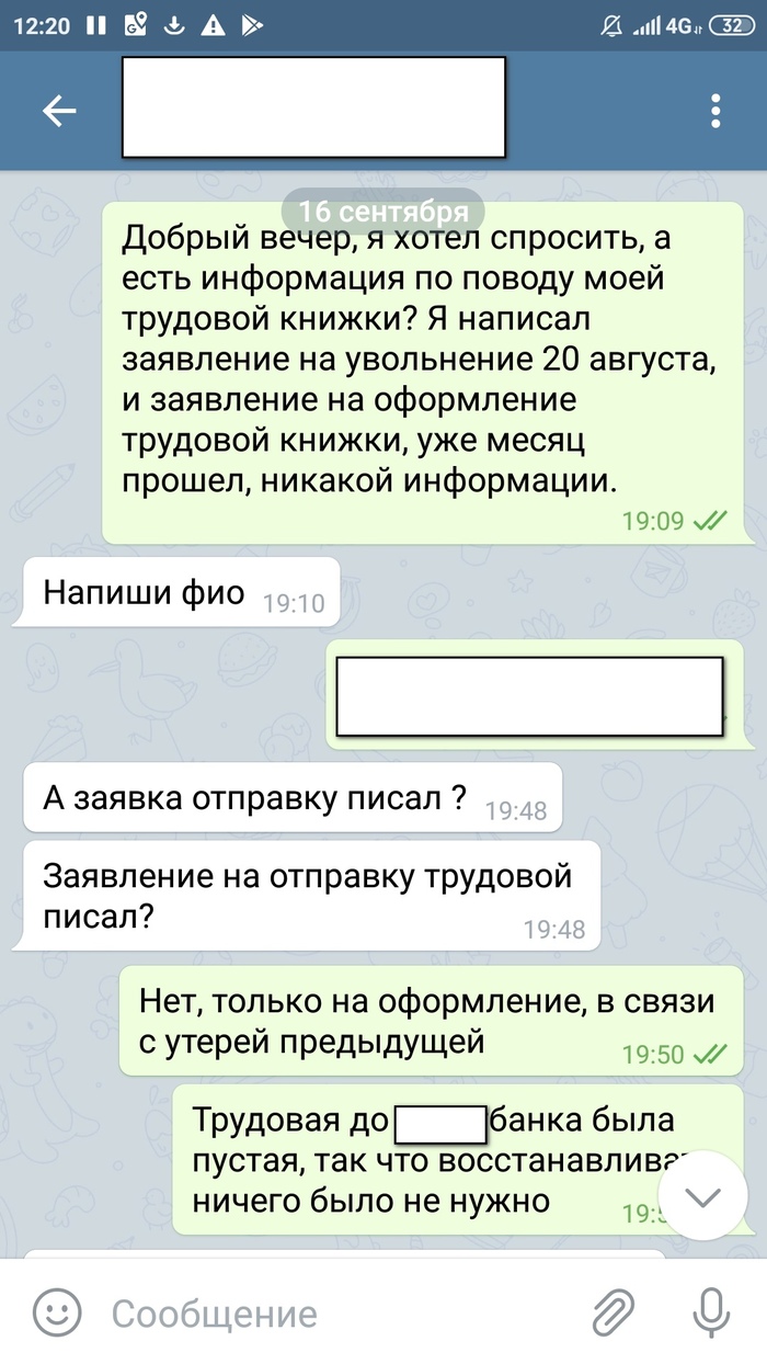 И, удивительно, началось шевеление. Она мне прислала форму на отправку трудовой в регион. Ок, заполнил. Далее мне пишет Денис, что этим всем должен был заняться Владимир ещё давно, но ничего не сделал. Просит заново заполнить заявления на увольнение и оформление трудовой, теперь датируемое 17ым сентября, плюс заявление на оформление трудовой, датированное 4-ым июля. Потом несколько раз пишет, чтоб переписал с другими датами. В итоге, в конечном варианте, мне написал сам Владимир, сказал поставить даты в заявлениях на увольнение и на отправку трудовой в регион - 18 сентября, а на оформление трудовой поставить 4-ое июля. Что я и сделал