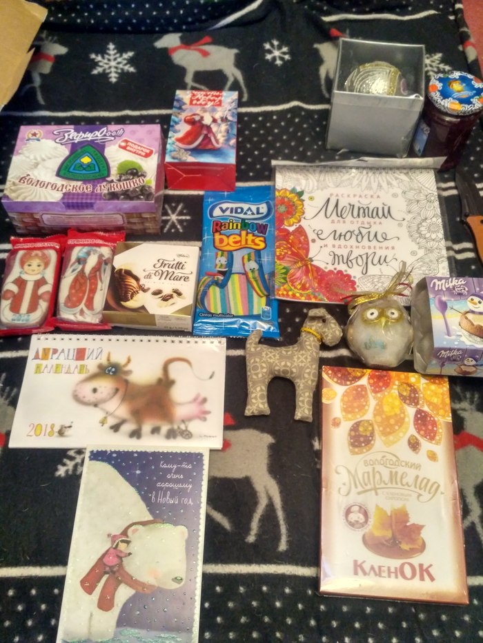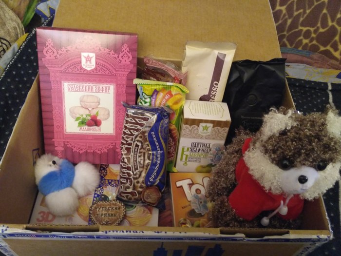 Вот мне и приехал мой последний из трёх обменов подарками от очень милой девушки Оли @Santana71 )) Даже не дождавшись извещения побежала на почту получить посылочку по трек номеру. Получила большую коробку в которой что-то интригующе перекатывалось))