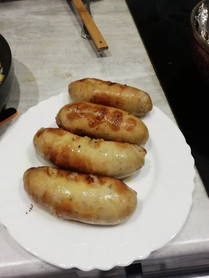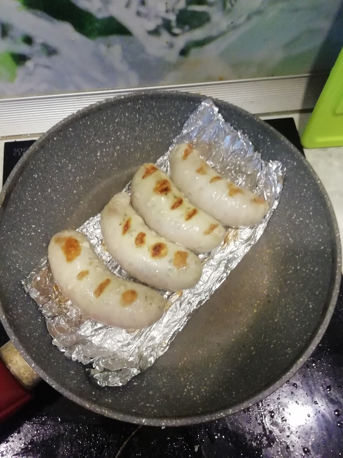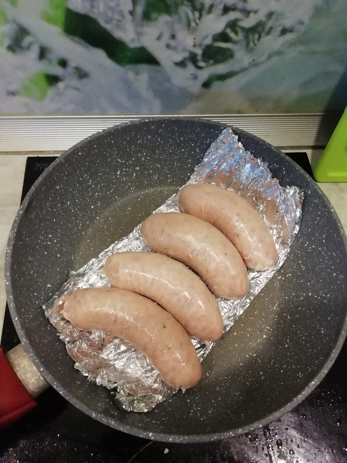 Решил к ужину пожарить купаты на гриле, но сковороды-гриль небыло, а уж электрогриля подавно. И путем смекалки и поварского опыта решил я сделать его своими руками из фольги. Раскатав лист (этого на фото нет(( и на подобие гармошки "сморщить" ребра и сие изобретение сложить на сковороду.