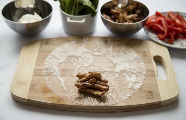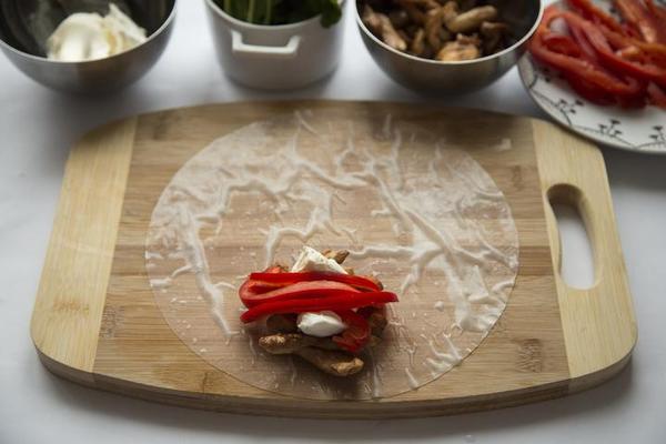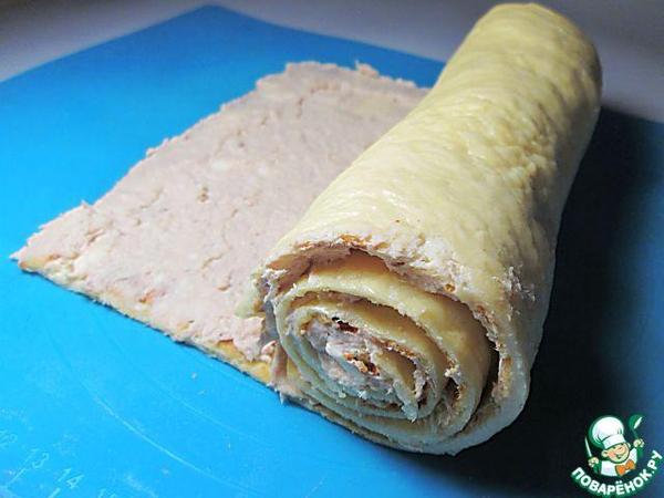 На противень выкладывать листы теста, раскладывая на каждом равномерно, но не монолитно начинку. Чередуя: тесто-начинка.