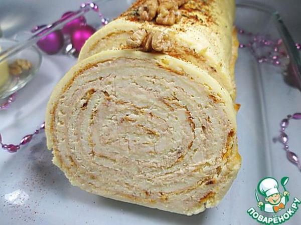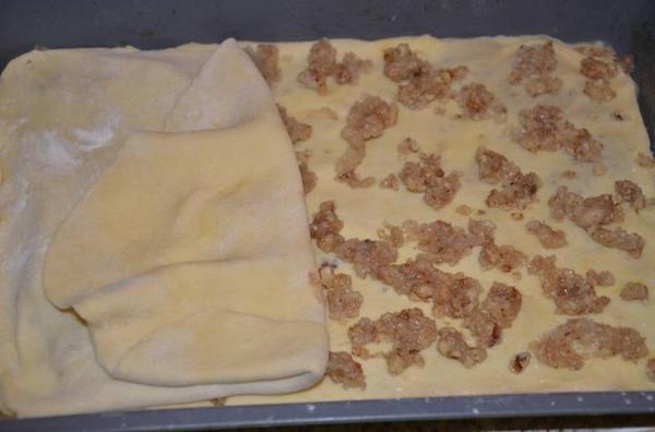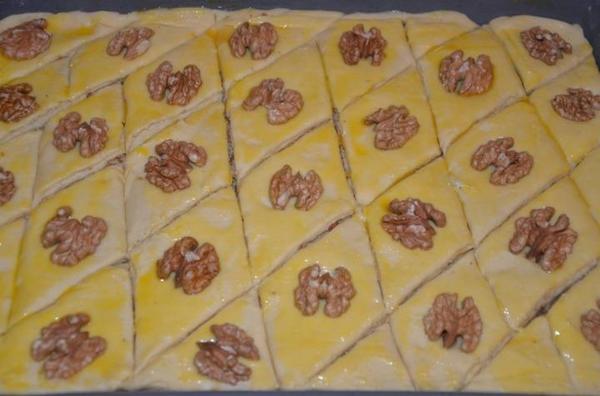 Последним слоем должно быть тесто. Разрезать получившийся пирог на ромбики, смазать желтком, украсить орешками. Выпекать минут 40-50 при 200 градусах.