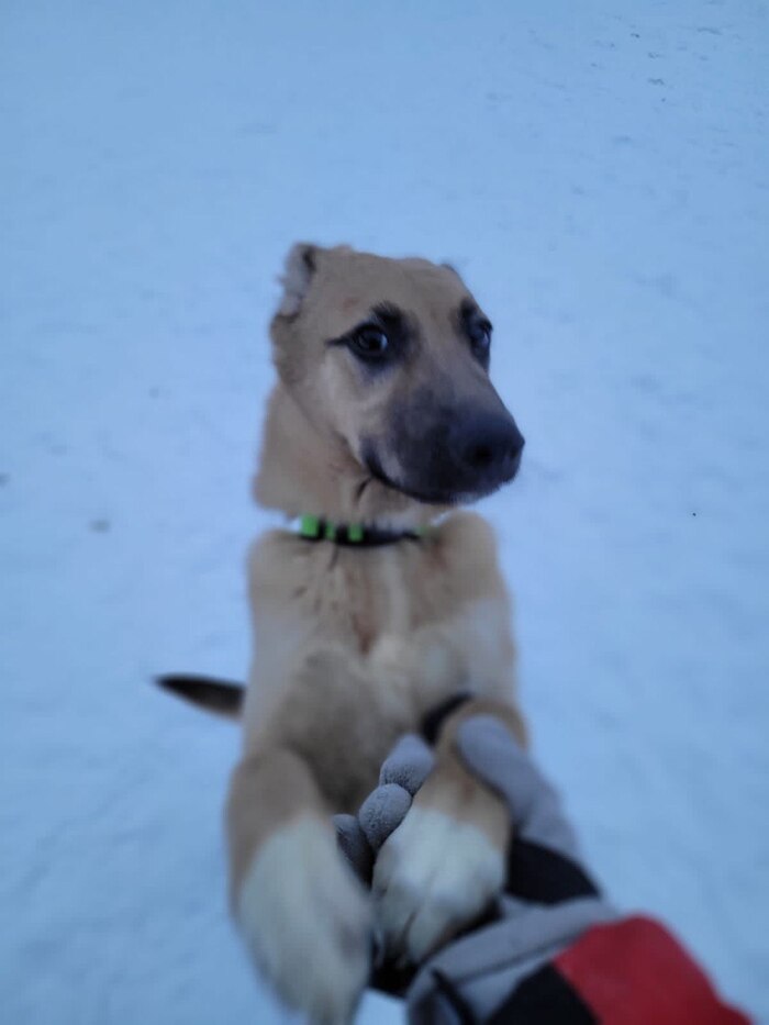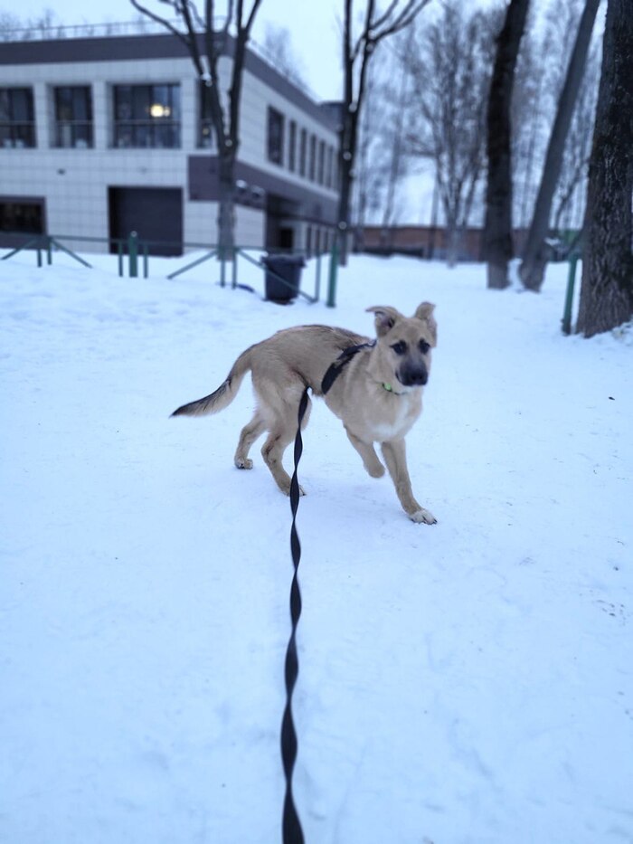Конт выучился ходить на поводочке за день, терпит на двухразовом выгуле, ловит всё с первого раза и готов обучаться всем командам.
