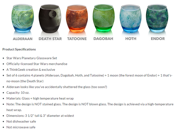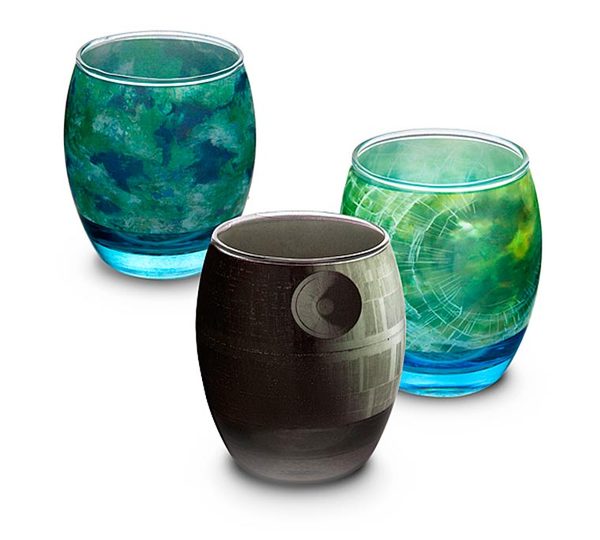 Перед выходом очередной части Звездных Войн всяческое барахло с тематическими изображениями заполонило прилавки всех без исключения магазинов. Чаще всего это типичный ширпотреб вроде футболки с некачественным логотипом, но попадаются и интересные вещи. Так, можно купить набор стаканов, оформленных в соответствии с наиболее известными небесными телами этой вселенной.