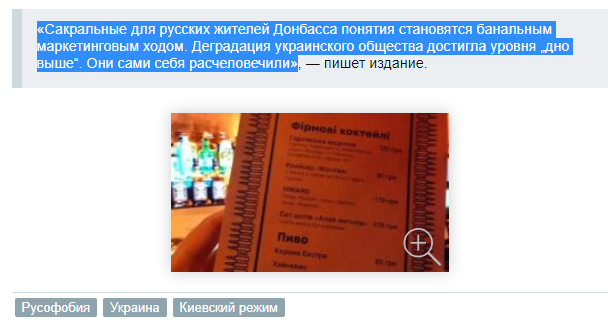 "В одном из кафе Львова замечено меню, в котором блюда названы "в честь" трагедий и преступлений против жителей Донбасса и России."