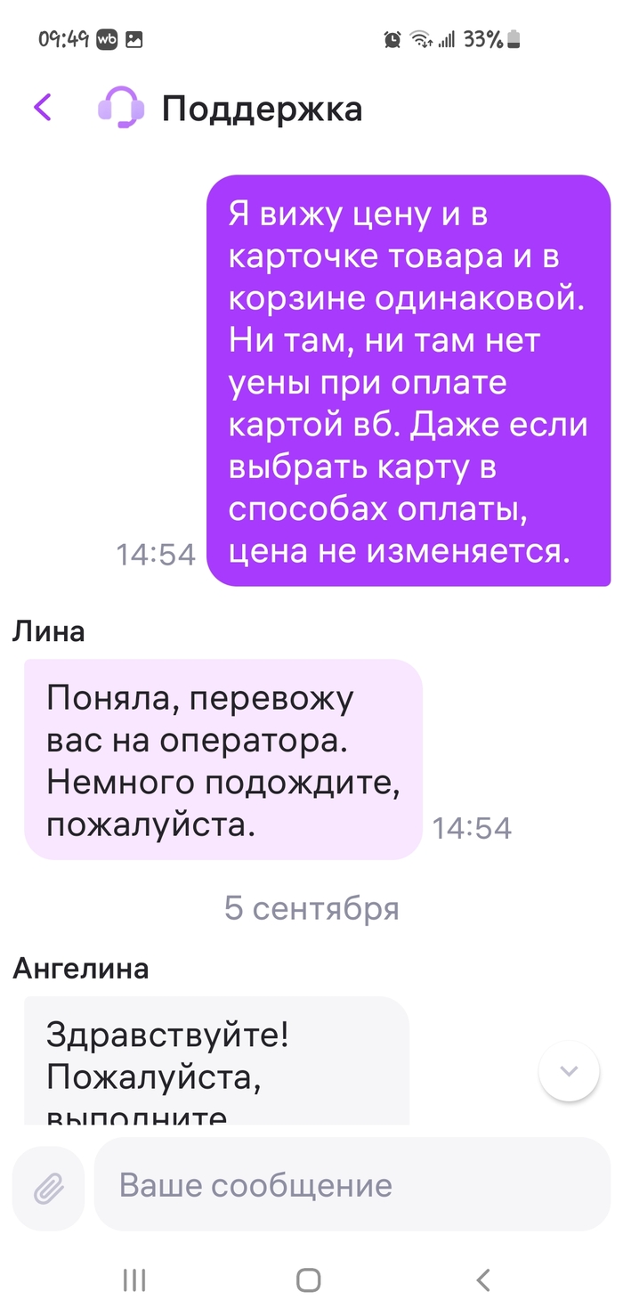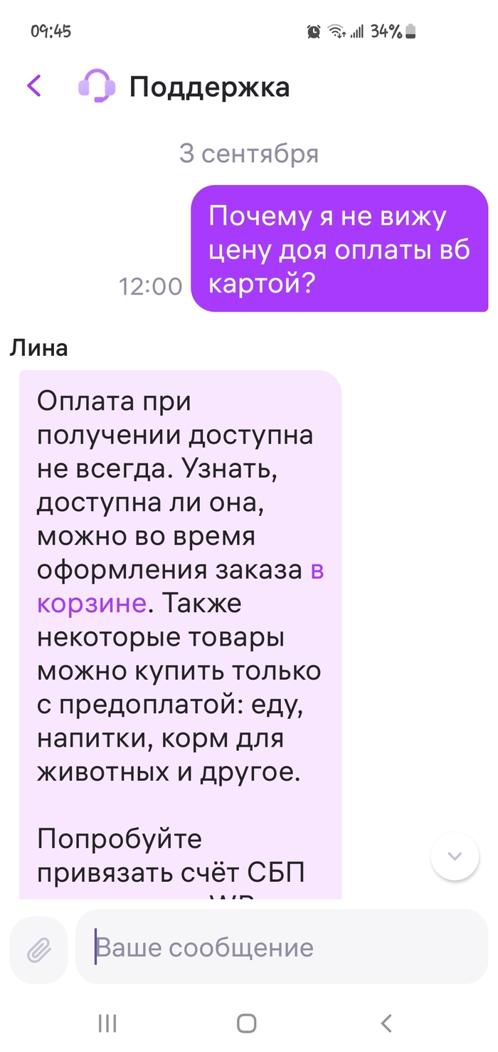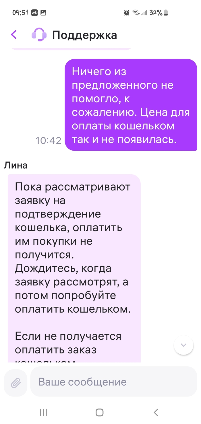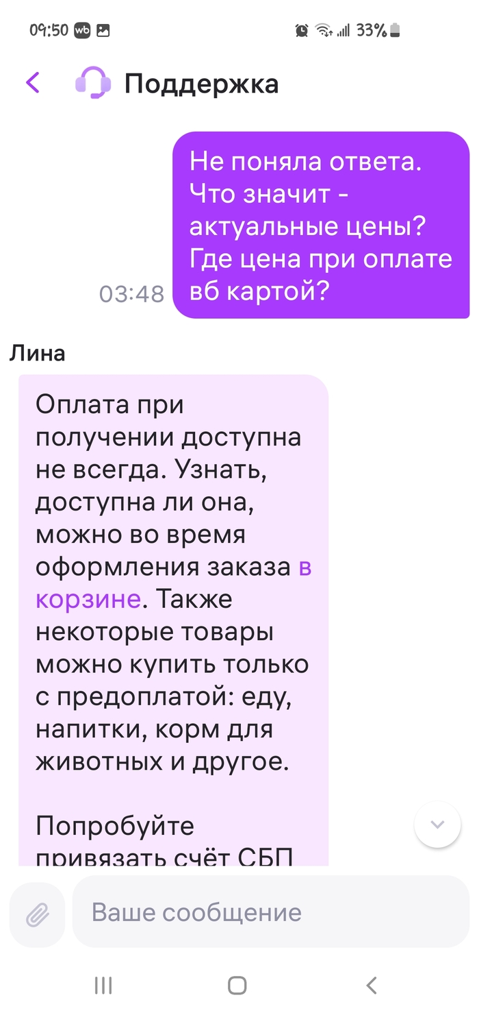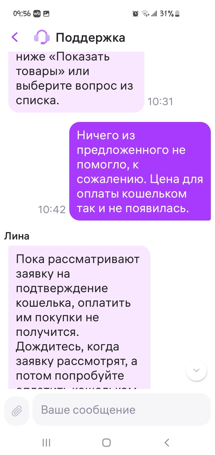 Уже неделю я не могу добиться от поддержки Wildberries ответа, почему для моего аккаунта у товаров нет цены для оплаты картой Wildberries, хотя она и подключена. Я не жалуюсь, я просто хочу понять как это исправить.
