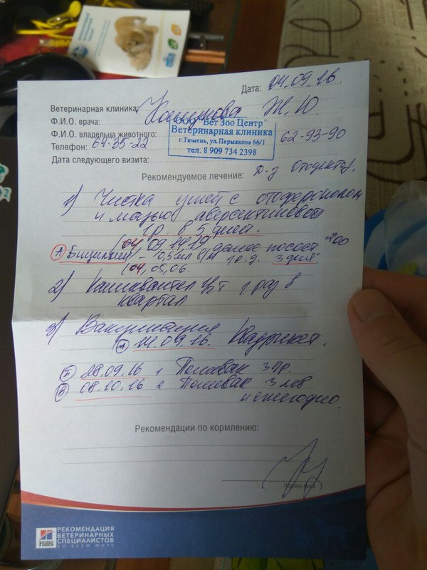 Кошка стала очень апатичной, постоянно прячется, не дает себя погладить. Я сразу же обстриг все комки шерсти, а это вышло почти на половину тела. Собрал вещи, и поехал на свое новое место жительства уже с кошкой. По приезду сразу же побежал к ветеринару, благо клиника находится в соседнем доме. Провели первичный осмотр, первую чистку ушей, обработку глаз, вкололи антибиотиков, проглистогонили. Чек вышел в общем-то не большой, на 1000 деревянных, но увы, это были последние деньги, т.к. на кануне все было отдано за оплату квартиры.