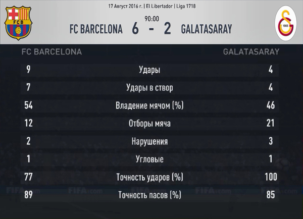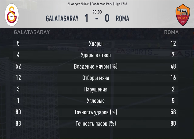 Галатасарай вновь подтвердил тот факт, что является весьма удобным соперником для Реала. Счет в этой встрече был открыт в первой же атаке мадридцев. Неспешная игра в пас на половине поля хозяев, рывок Родригеса за спины защитников и своевременный пас Бензема колумбийцу в свободную зону – это все, что нужно для выхода один на один с голкипером и открытия счета в этом матче. И дальше игра развивалась так же под диктовку «королевского» клуба. Реал играл неторопливо, даже академически. Перекрыв все подступы к собственной штрафной, гости не торопились в чужую. Пару раз Муслеру потревожили ударами с линии штрафной Роналду да Бензема, но это для голкипера была всего лишь разминка. Во втором тайме испанцы все-таки заставили капитулировать стража ворот Галатасарая во второй раз. Бензема принял мяч в штрафной турецкой команды, в окружении двух соперников, и умудрился отдать точную передачу на Роналду. Португальце никто не помешал «расстрелять» ворота с шести метров. Чуть позже третий гол в свои ворота едва не привез Муслера. Выбивая мяч из штрафной, он попал точно на ногу Родригесу. Колумбиец моментально оценил ситуацию и первым же касанием попытался перебросить голкипера и поразить пустые ворота. К его сожалению, удар получился слишком сильным, и круглый перелетел через перекладину. За десять минут до конца встречи игроки Галатасарая дождались наконец-таки ошибки со стороны Реала. Навас неаккуратно ввел мяч в игру, Инан «обокрал» Родригеса и перевел снаряд в свою линию атаки. А там уже Подольски и Снейдер разыграли нехитрую «двоечку», и последний не сильным, но точным ударом в самый угол сократил отставание в счете. Однако Реал сразу же восстановил разницу в счете. Модрич и Бейл на пару прошли с мячом по правому флангу, и хорват исполнил точнейшую передачу между соперниками на свободное место. Как раз туда, куда врывался Бензема. Француз мощнейшим ударом вонзил мяч в дальний угол и, таким образом, добавил к двум голевым передачам еще и гол, благодаря чему он и получил звание Лучшего игрока матча.