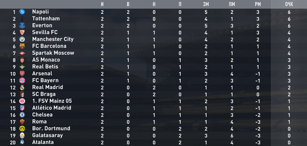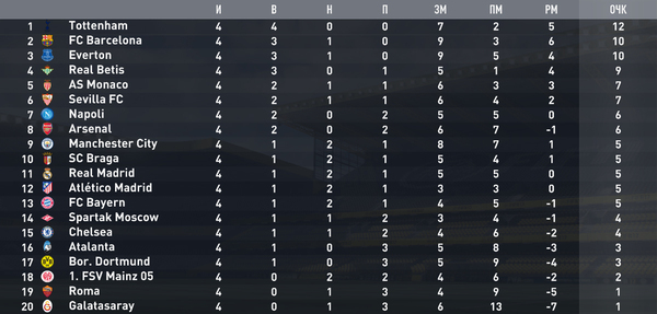 Тоттенхем и Майнц продолжают держать нули соответственно в графах "поражение" и "выигрыш", собственно, как и Боруссия с Наполи еще не с кем не играли вничью. Плотность таблицы велика, за один удачный матч можно, например, с 17-ого места подняться на 11-ое, или наоборот, со второго рухнуть седьмое.