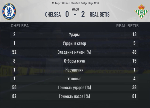 Спартаку позарез нужны очки, чтобы выбраться из «зоны стыков». Поэтому красно-белые с первых минут яростно пошли в атаку. Уже на десятой минуте Джано придумал шикарную передачу на Зе Луиша. Хозяев от верного гола спас лишь отчаянный бросок Адана в ноги форварду. А вот надежный обычно Ребров в этот вечер допустил серьезную ошибку. После навеса Дурмиси с правого фланга в штрафную голкипер как-то неуверенно пошел на перехват, но мяч не поймал, а отбил. Но не далеко, как раз на линию штрафной, где ждал своего шанса Себальос. И дождался. Первым касанием он подработал игровой снаряд, а вторым отправил его точно в угол ворот. Ребров, потерявший в этот момент ворота, справится с этим ударом не смог. Но это было еще не все. Не прошло и десяти минут, как Бетис организовал второй гол в ворота Спартака. Санабрия, получив мяч на подступах к штрафной красно-белых, элегантным пасом пяткой оставил в дураках Кутепова, тем самым помог Пардо выйти один на один с вратарем. И вновь голкипер был бессилен. Спартак навалился на ворота Адана всей мощью, какую мог себе позволить. Но оборона Бетиса держалась, как в лучшие матчи начала сезона. Сразу же после второго пропущенного, Промес вывел на удар Зе Луиша, но угол был слишком острым, и прошить вратаря не получилось. Мяч отскочил к вездесущему Промесу, и голландец уже головой скинул его на свободного Глушакова. Капитан москвичей бил, казалось бы, наверняка, но героический подкат Пеццеллы спас испанскую команду от гола. Красно-белые продолжали атаковать, нанеся в итоге за первый тайм двенадцать ударов по воротам соперника, но лишь пять из них шли в створ и не один не достиг цели. Зато у хозяев поля за то же время статистика была куда более впечатляющая: два удара, оба в створ, оба результативные. Во втором тайме у «мясных» перестали получаться атаки, видимо команда отдала все силы еще в первой половине встречи. А вот хозяева поля угрожать воротам Реброва стали гораздо чаще. Артем трудился в поте лица, но с выстрелом Себальоса в правую от себя «девятку» справиться шансов у него не было. Как итог: крупная победа хозяев поля при относительно равной игре. Спартак, как мне кажется, на гол на играл, но фатальное невезение лишило его этой возможности.