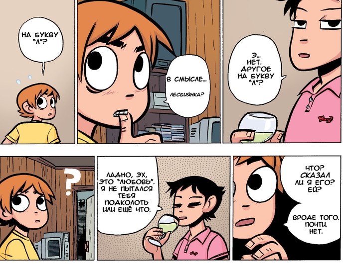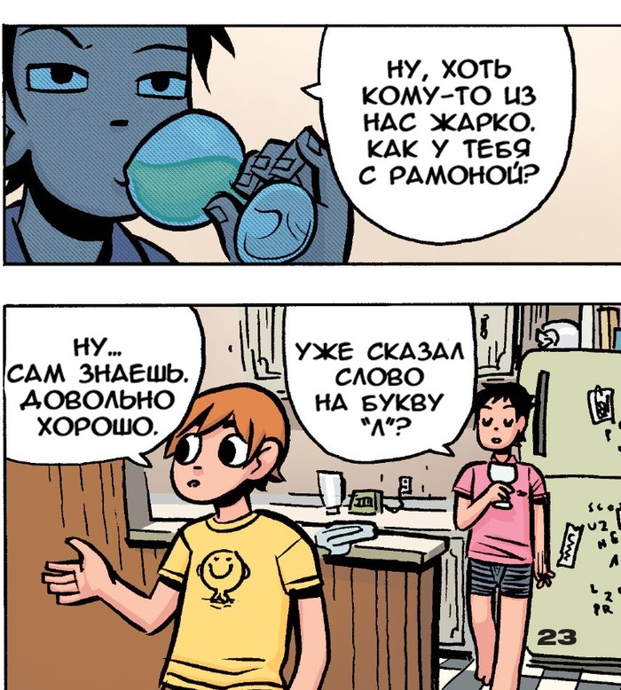 Кадр из фильма, где Скотт встречает четвёртого злого бывшего/бывшую и страничка в комиксе (4 том)