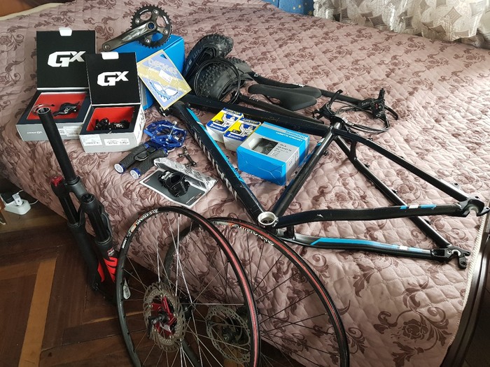 Пока все ехало, подумалось, а может и раму уж тогда сменить, чтоб и она была под 27.5? Как оказалось, купить бюджетную раму в России задача не простая, ибо рамами особо никто и не торгует вовсе. Тащить из-за бугра не совсем бюджетно выходило. Начал копаться на авито, но опять же, не хотелось б/у. В итоге набрел на объявление о продаже рамы Marin Bobcat Trail 7.5 2015 с разборки нового велосипеда, как потом выяснилось, продавец является официальный дилером Marin в России. Позже там же нашелся подседельный штырь с седлом и настал долгожданный момент, когда можно приступать к сборке: