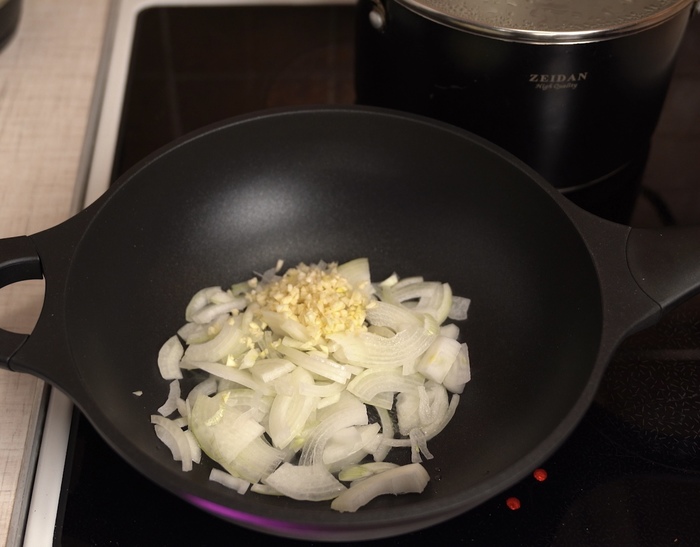 Лук мелко нарезаем, обжариваем до прозрачности на растительном масле, добавляем