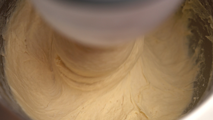 2. Смешайте яйца, соль, сливочное масло и дрожжи. Постепенно добавляя просеянную муку. Вымешайте тесто до однородности.