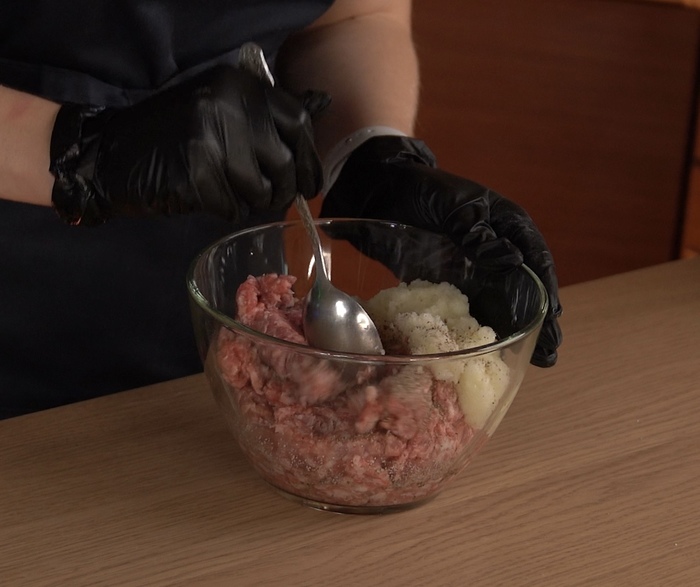 1. Бекон нарезаем на маленькие полоски и обжариваем до хрустящий корочки, измельчаем его при помощи ножа или блендера. Фарш желательно делать при помощи блендера, так он получается более однородной консистенции. Добавляем бекон в фарш и перемешиваем. В фарш добавить соль и перец по вкусу. Формируем котлеты, размер котлет должен быть процентов на 20-30 больше размера булочек, котлеты не должны быть толстыми.