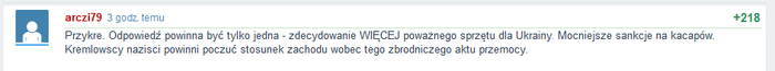 arczi79 "Досадно. Ответ должен быть только один - однозначно БОЛЬШЕ серьезной техники для Украины. Больее сильные санкции на кацапов. Кремлевские нацисты должны ощутить отношение запада на счет этого преступного акта насилия." +218