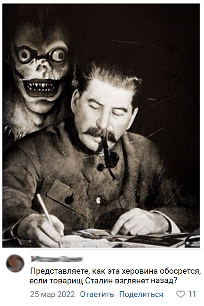 И вот в силу этих нюансов, я бы ВК-шных "антисталинистов" прировнял к тоталитарной секте. И ввел бы право на свободный отстрел (шутка, конечно, законы РФ надо соблюдать!).