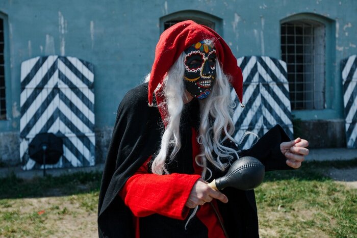 Переодеваясь (первая команда обычно приходит на мою точку минут через сорок после начала, так что занимаюсь я этим уже обычно когда все разошлись по этапам - закончив все остальные дела), обнаруживаю что под впечатлением от новостей радостно продолбал взять из дома камизу (это льняная рубаха, если что) и бандану. Без банданы родная маска будет постоянно сползать во все стороны. Ну что уж теперь. Благо, прогреться форт успел - так что я даже не замерз.