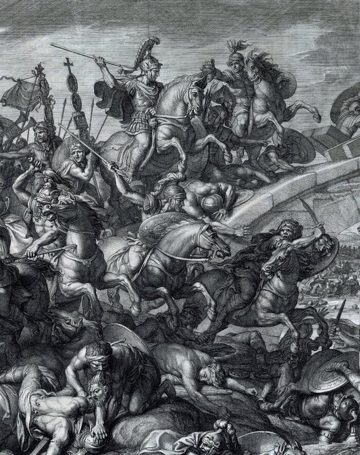 Примерное вооружение римской армии в те годы. Особенно хорошо удалось художнику передать энтузиазм военных, оценивающих смогут ли они внешним видом отпугнуть опасность.
