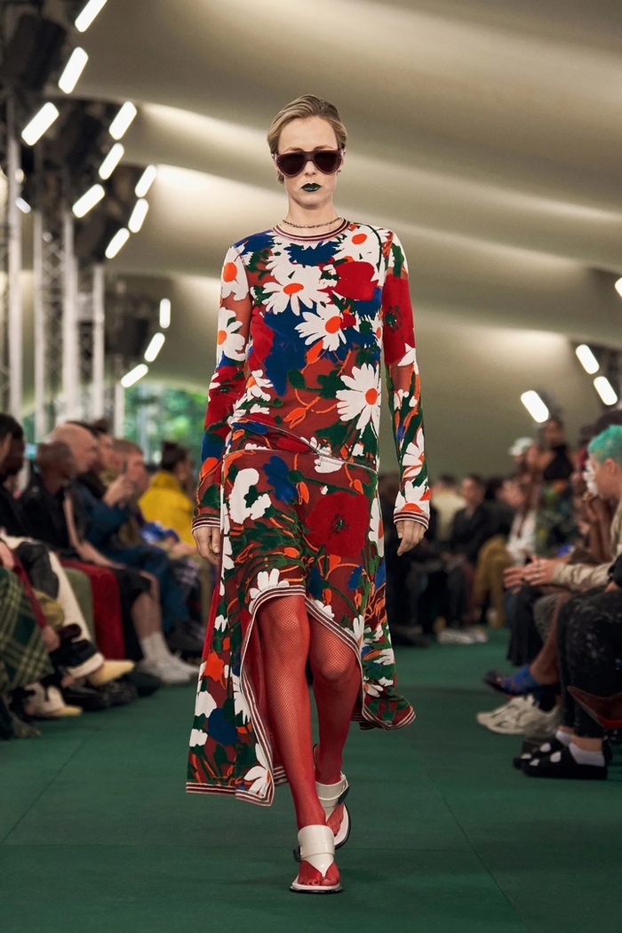 В новой коллекции Prada мы видим футуристический сет-дизайн, который напоминает нам о невиданных пришельцах, и графику, посвященную взаимодействию человека и технологий. Особенно трогательно вспомнить выход Клаудии Шиффер на шоу F/W 1996. Миучча также не осталась в стороне, предлагая в этой коллекции плотные юбки, деконструированные водолазки и идеальные брючные костюмы, которые можно носить с оверсайз-худи.