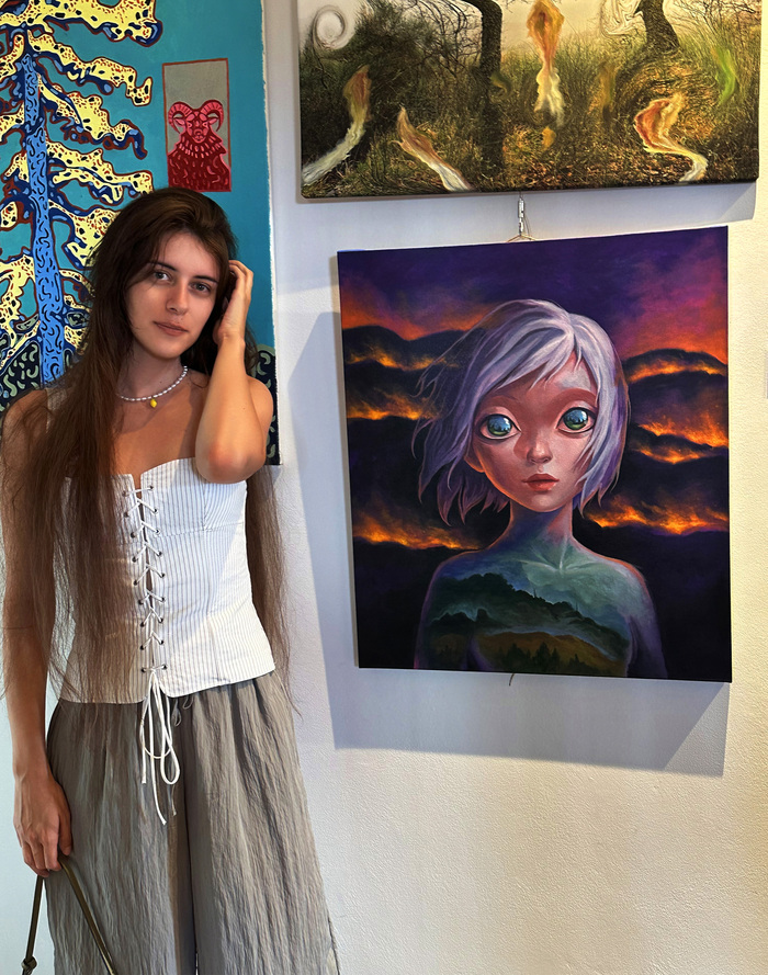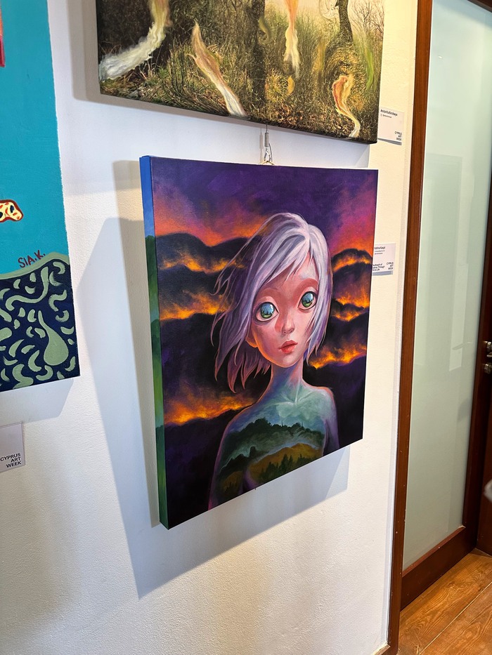 Я пишу в стиле поп-сюррелизм и картина акрилом на холсте несёт название «Дыхание Кипра: сквозь огонь - к жизни».