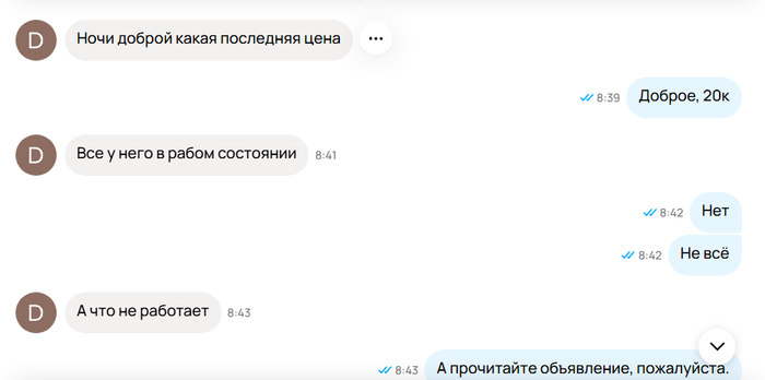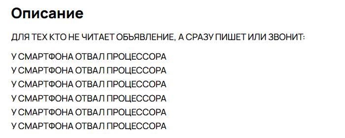 Причём, один сказал, что объявление читал и готов сейчас купить, на вопрос:"А в курсе, что с телефоном проблемы?", сказал, что дддда. Я сказал ок, снизил цену и ... Никто ничего не заказал.