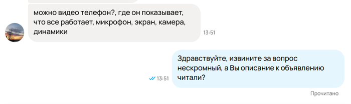 Этот просил возврат, если не понравится что-то в телефоне, там, лагать будет или камера плохо работать. Сказал, что читал объявление.