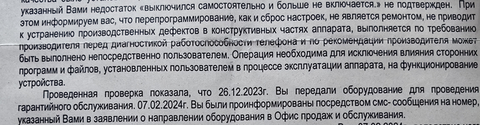 Номер, с которого отправляли смс говорить не хотят. Делаю распечатку смс, где нет ни одного постороннего номера. ВЫ думаете они признают свою ошибку? Нет, пишут, что все отправляли, сроки не нарушали и обратите внимание: указанный дефект - самостоятельно выключился и не включается , не подтвердился.