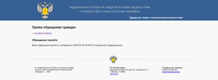 Никаких подтверждений о приеме сообщения в Роспотребнадзор не пришло. Через 5 дня будет месяц, как нет ответа. Друзья сказали, что просто пришлют отписку как юрист в мегафоне в последнюю секунду.