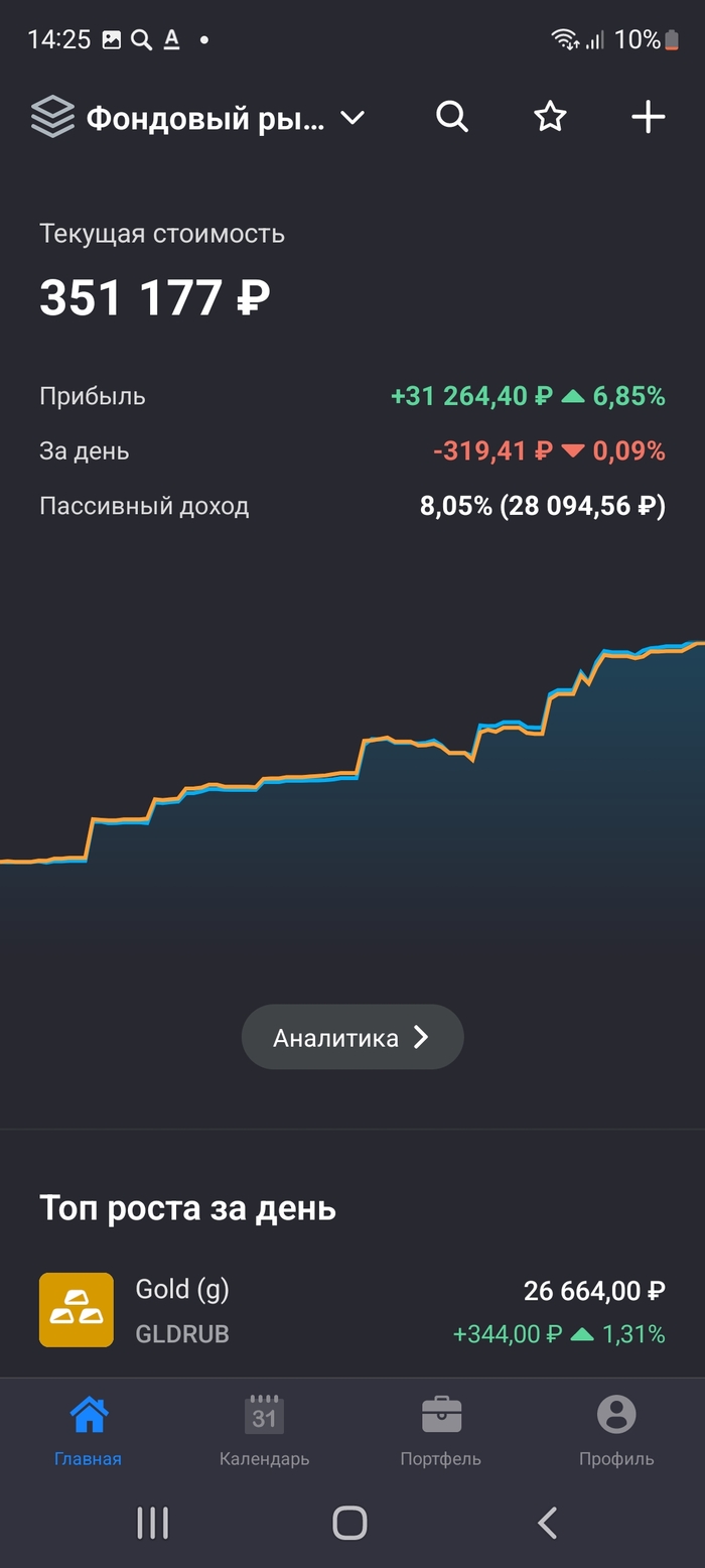 Теперь мой скромный портфель составляет 351 474 вечно деревянных. Здесь пока решил не учитывать счёт в Альфа-инвестициях на 51000, т.к. часть бумаг там заморожена, а остальные не заносятся в Snowball из-за кривого отчёта Альфы. Подумаю, что с ними сделать, чтобы уже полноценно отображались данные из всех брокерских приложений.