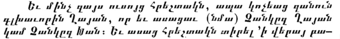 В своей «Истории народа стрелков» армянский историк 13 в. Григор Акнерци (инок Магакия) также в первую очередь называет у Тэмуджина титул каана[2] (направление армянского письма - слева направо, сверху вниз):