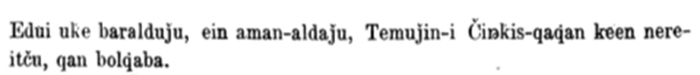 В «Тайной истории монголов» 13 в. Тэмуджин тоже именуется каганом, например, в §123 (ниже представлены транслитерация китайско-монгольского письма и транскрипция китайско-монгольского письма, переложенного на уйгуро-монгольское письмо)[6]: