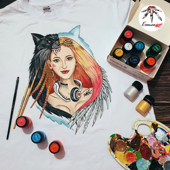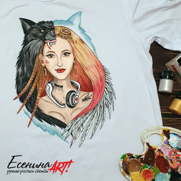 А вот в этой работе заказчик хотел видеть: девушку, совмещение этнического и современного, что-то связанное с музыкой, розовые волосы, дреды, что-то фэнтезийное, клык как у вампирессы, шапку в виде лисы или волка, как у Дуротана, и...было что-то ещё :)