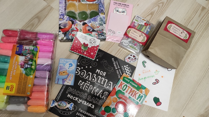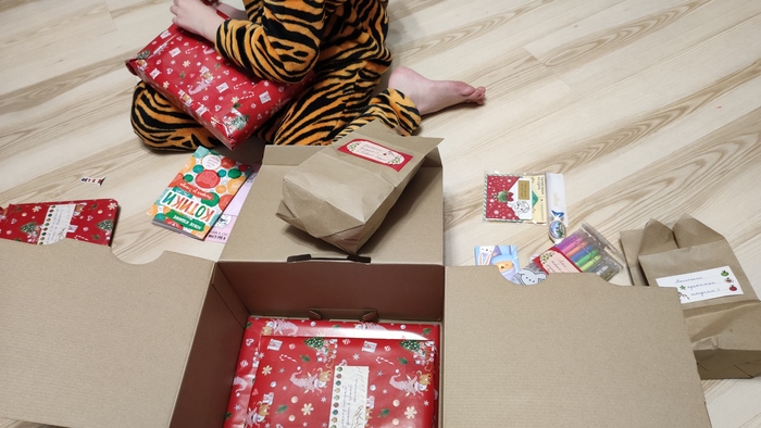 К нам пришла большая коробка, чего мы совсем не ожидали, ведь мы договаривались о бюджетном подарке ! Чего тут только нет! Всё аккуратно упаковано и подписано! Всё, о чём мечтает, наверное, каждая девочка)) Здесь и сладости, и раскаски, и альбом с заданиями, очень-очень милое письмо, даже настольная игра, игрушка для младшей сестрёнки, и многое другое))