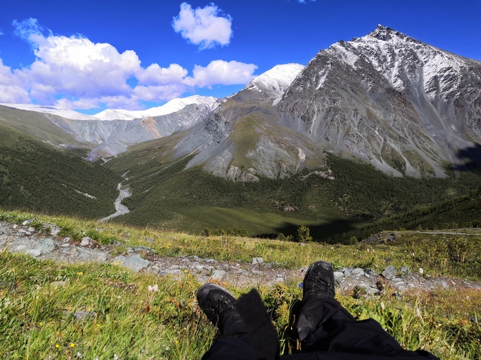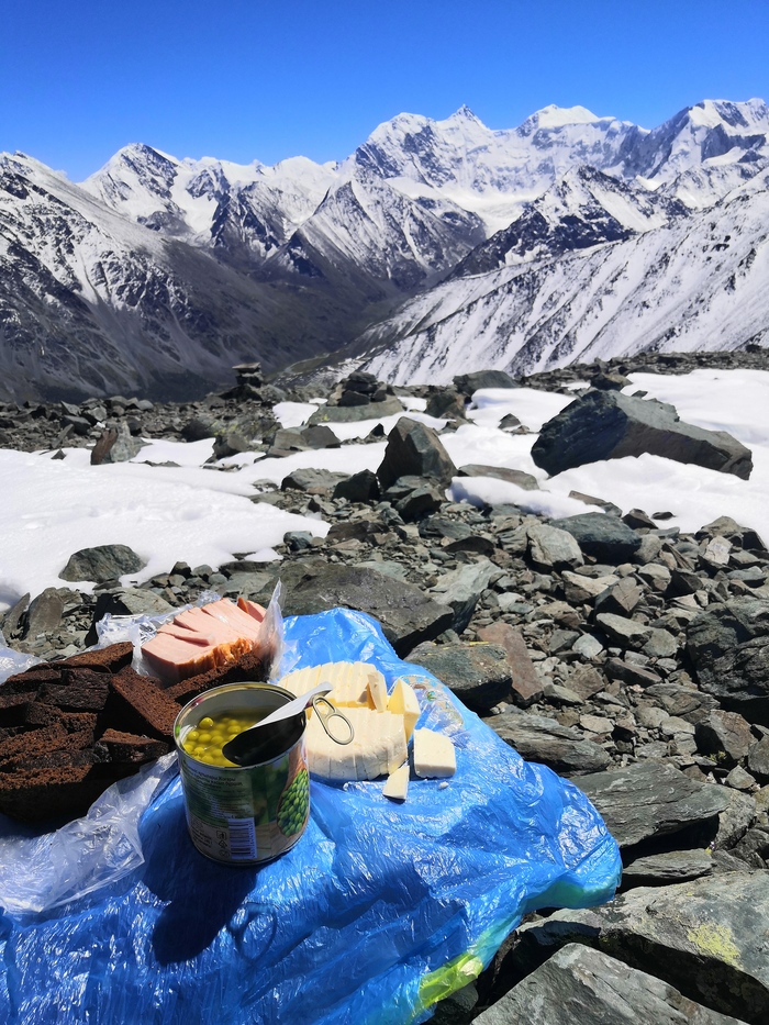 Впереди Белуха, внизу озеро Акем, а это наш "обед" и дальше в путь