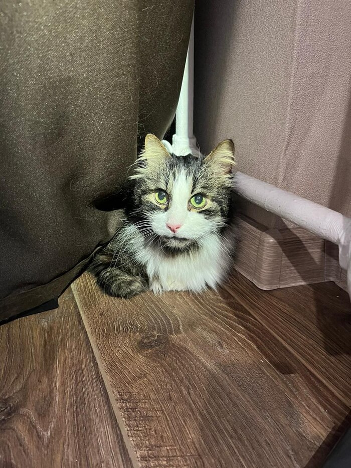 Кот очень красивый, длинношёрстный, ласковый, но пугливый. Судя по наличию всего 1 клыка, кот не молодой, явно домашний. Шерсть с колтунами, но видны следы выстригания. Объявлений о его поиске в нашем районе не видели. Временно взяли к себе.