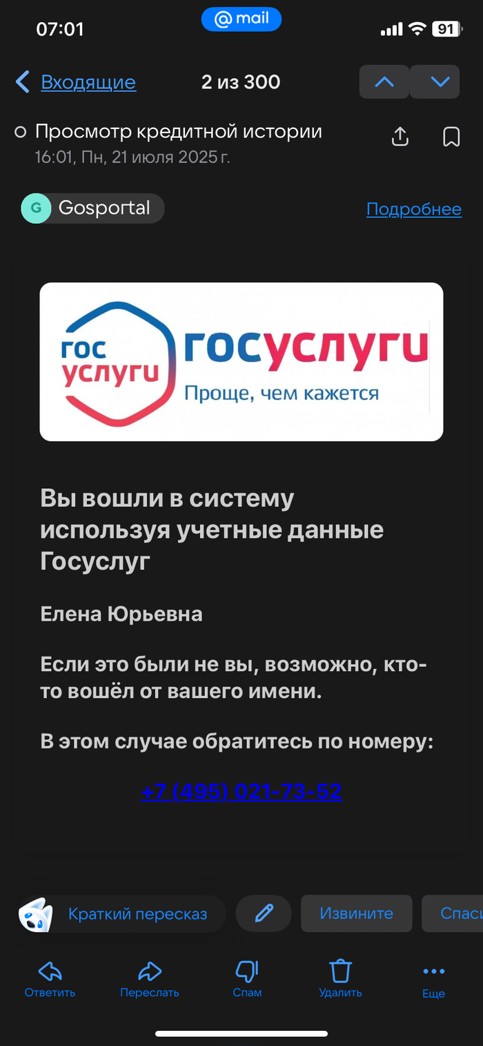 6 Kudryun 3 месяца назад Ответ на пост «Новая схема?»5 Тоже пришло на почту сообщение, только от отправителя «Gosportal», и, честно признаться - сначала письмо вызвало волнение и первые секунды была мысль позвонить по указанному в письме номеру. Будьте аккуратнее, схема набирает оборот. Показать полностью 2 [моё] Мошенничество Интернет-мошенники Госуслуги Негатив Скриншот Ответ на пост Длиннопост Волна постов Ещё 0