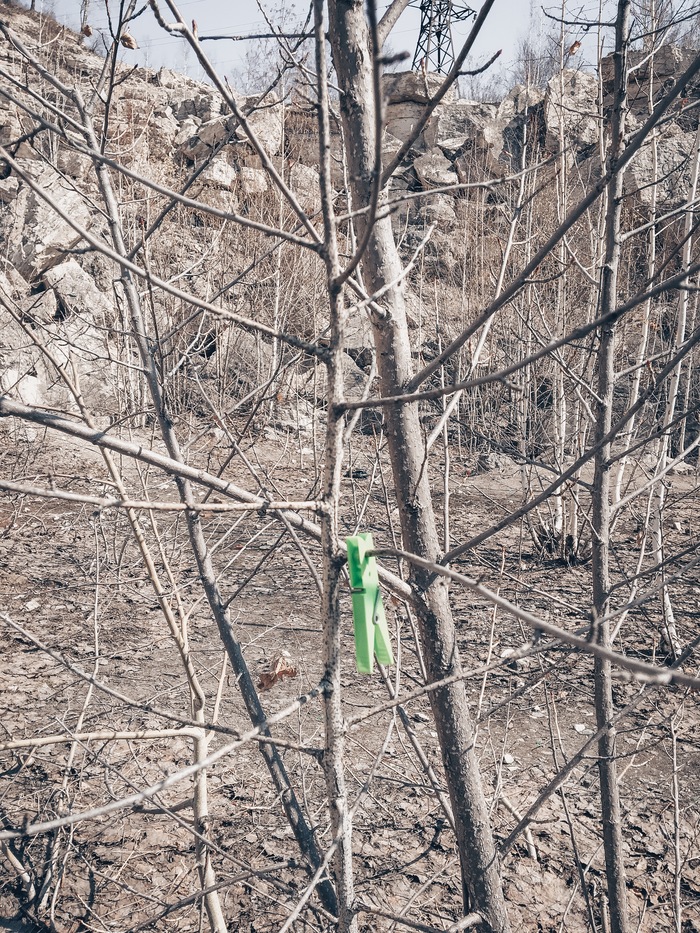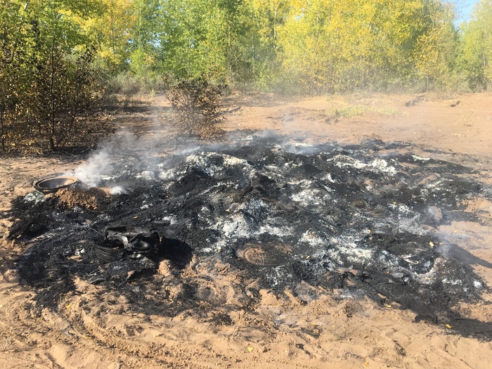 Среди деревьев было не разобрать, поэтому подумали, что рыбаки жгут костёр. Подойдя поближе увидели, что там целый полигон жжённой резины, просто разбросанной и подожженной резины. Посреди леса и сухостоя.