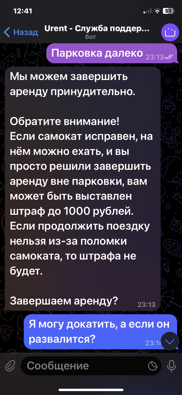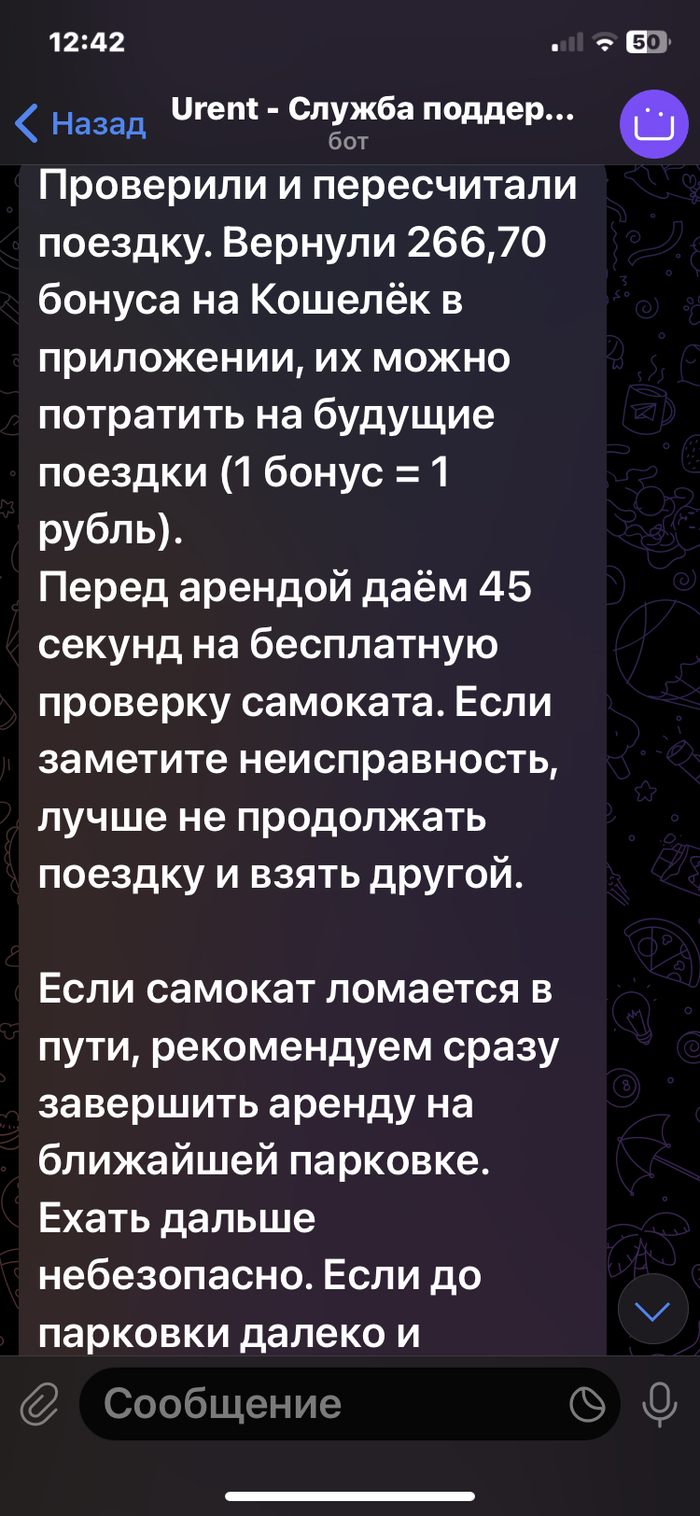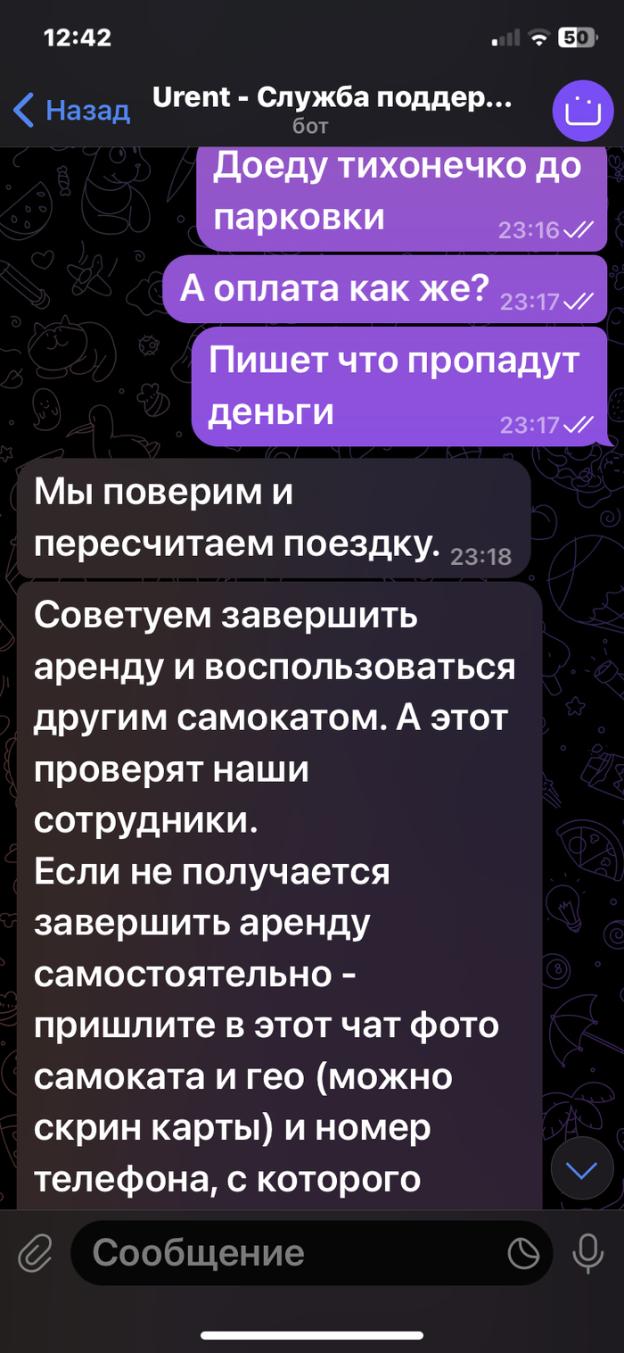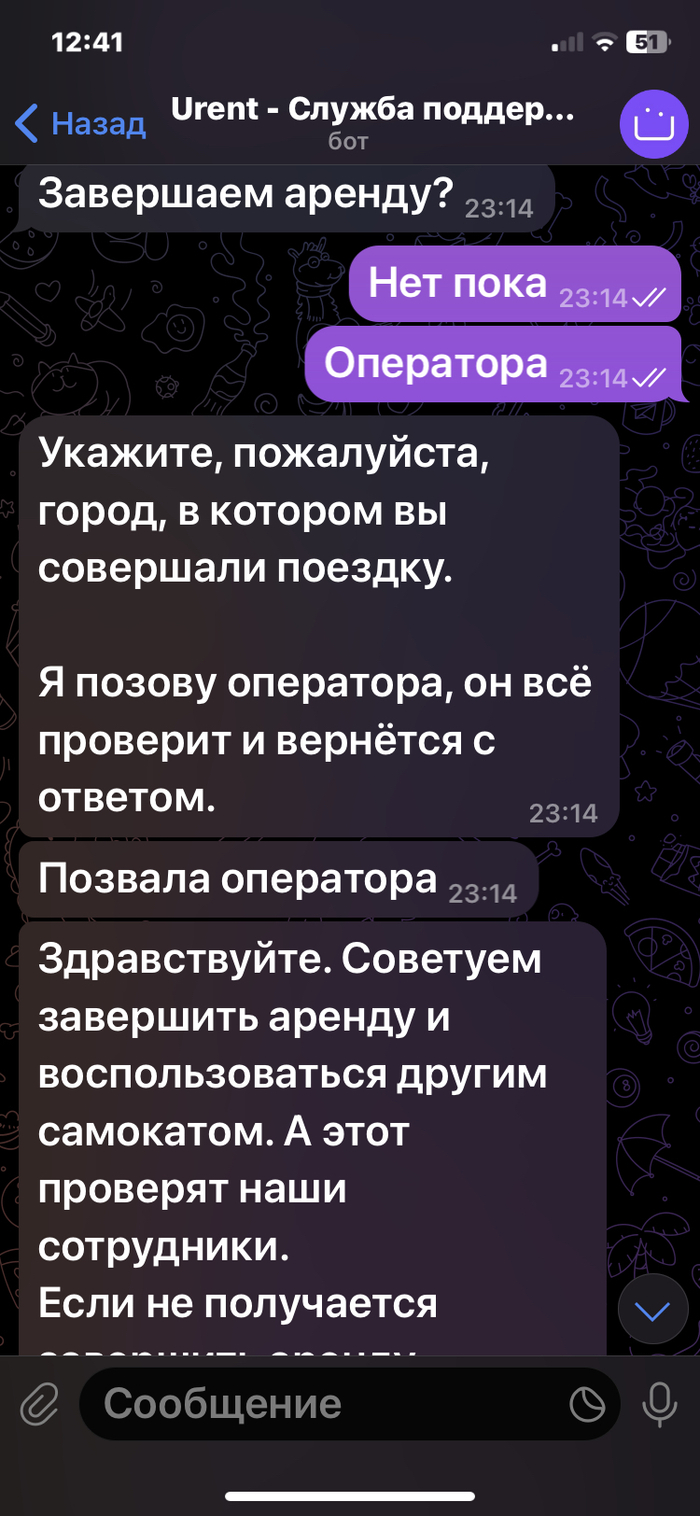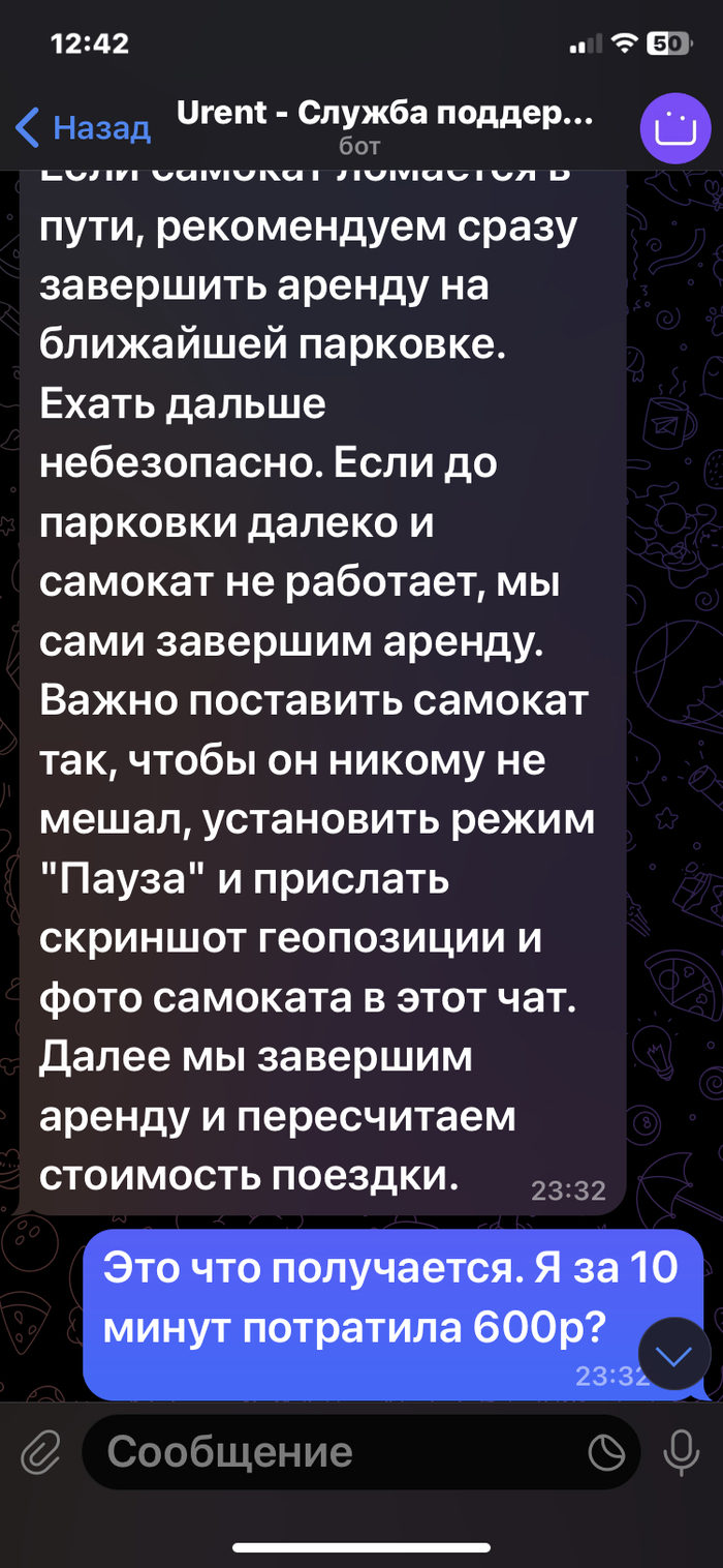 Появилась у этого сервиса услуга взять самокат на время, пока не сядет батарейка. В среднем это 4 часа и стоит 899р. Дождавшись позднего вечера, когда людей минимально, доехала до первого самоката со 100%. Я, убедившись что визуально самокат приличный, начала аренду. Метров через 200 стало дребезжать колесо. Сначала я подумала что это из-за брусчатки. Но когда выехала на ровную асфальтированную дорожку, дребезжание никуда не делось. И я написала в поддержку. А дальше началось вакханалия, которая закончилась только что. Если коротко, чтоб арендовать самокат за 900р, держите 1800) ибо и депозит (а когда он вернётся хз), и оплата поездки. А если вдруг самокат неисправен, то «нате вам бонусов вместо денег. Но не все. Нет. И вопрос решать будем максимально долго. Ибо у нас нет горячей линии. И даже не извинимся.»