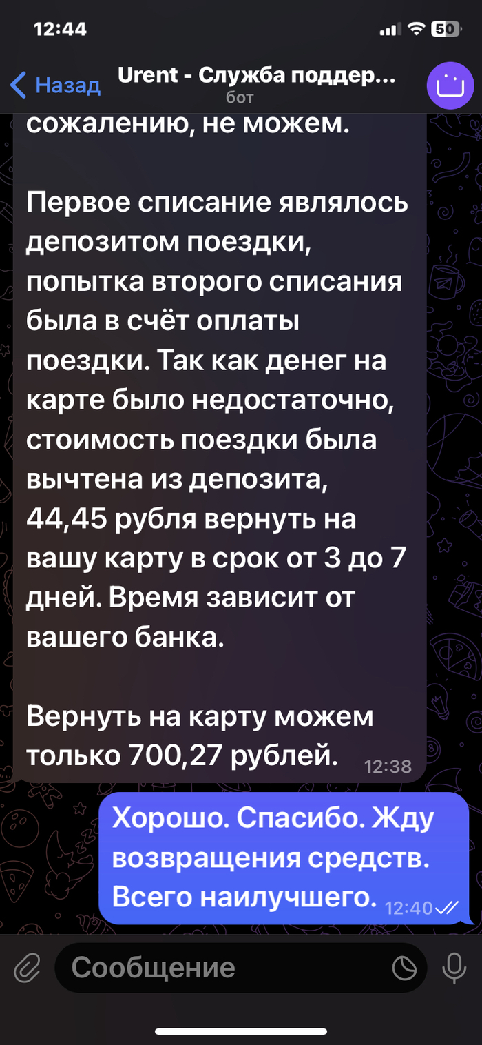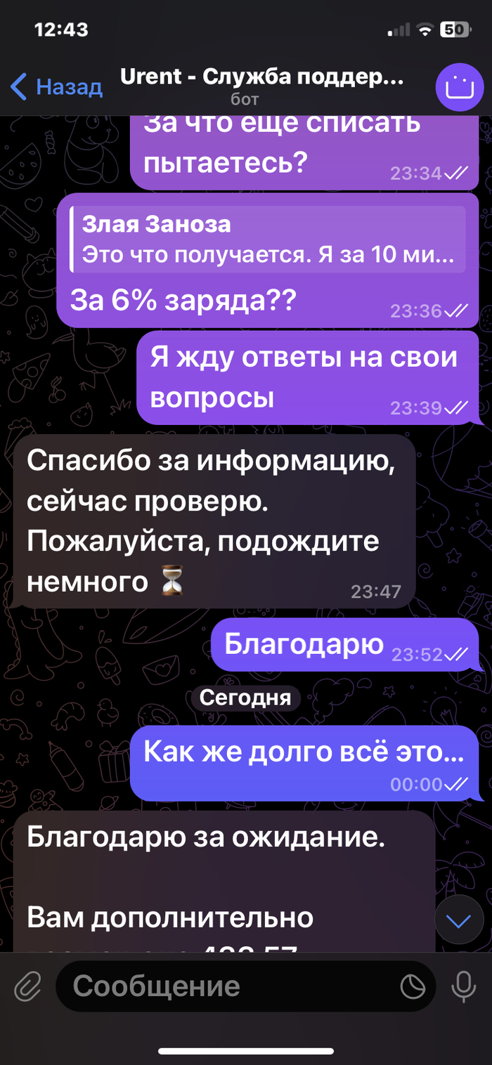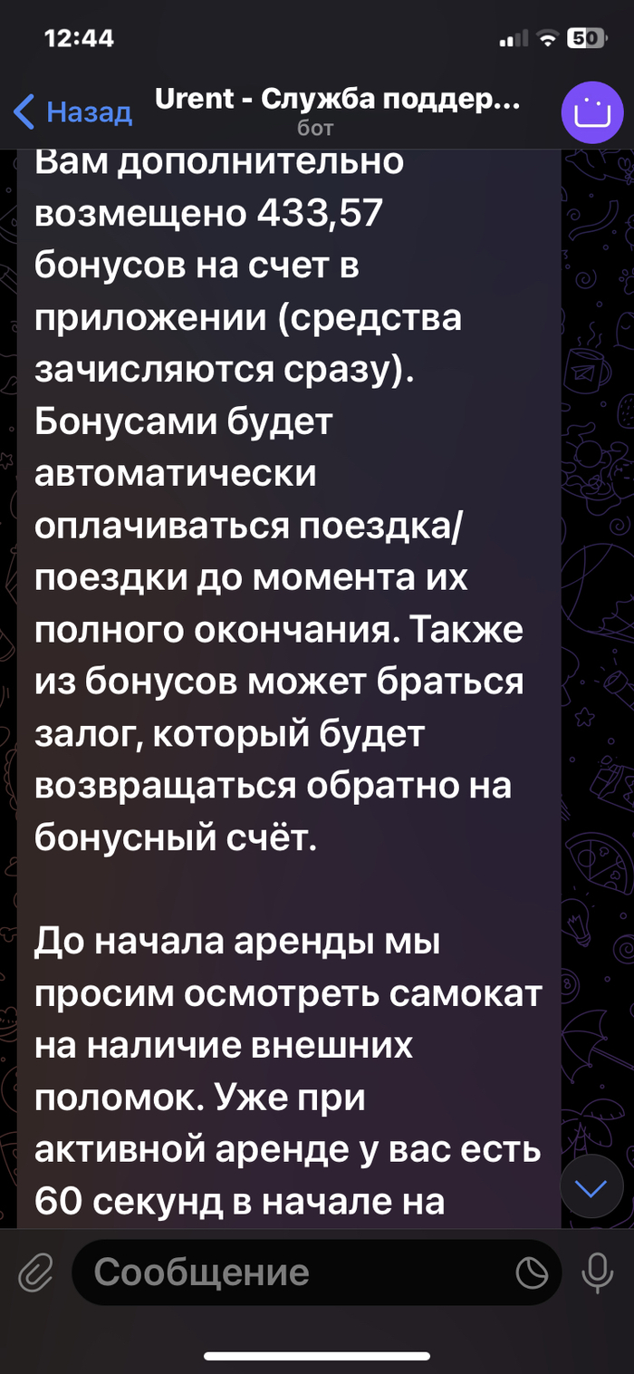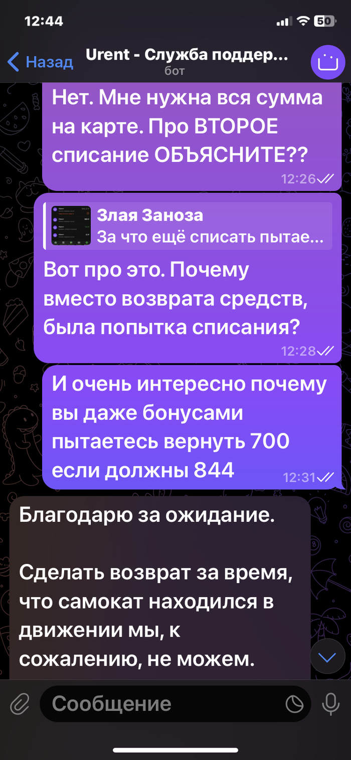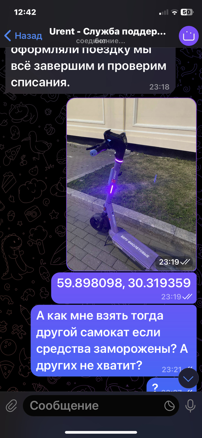 Появилась у этого сервиса услуга взять самокат на время, пока не сядет батарейка. В среднем это 4 часа и стоит 899р. Дождавшись позднего вечера, когда людей минимально, доехала до первого самоката со 100%. Я, убедившись что визуально самокат приличный, начала аренду. Метров через 200 стало дребезжать колесо. Сначала я подумала что это из-за брусчатки. Но когда выехала на ровную асфальтированную дорожку, дребезжание никуда не делось. И я написала в поддержку. А дальше началось вакханалия, которая закончилась только что. Если коротко, чтоб арендовать самокат за 900р, держите 1800) ибо и депозит (а когда он вернётся хз), и оплата поездки. А если вдруг самокат неисправен, то «нате вам бонусов вместо денег. Но не все. Нет. И вопрос решать будем максимально долго. Ибо у нас нет горячей линии. И даже не извинимся.»