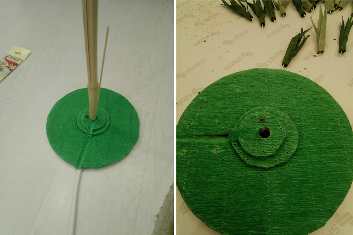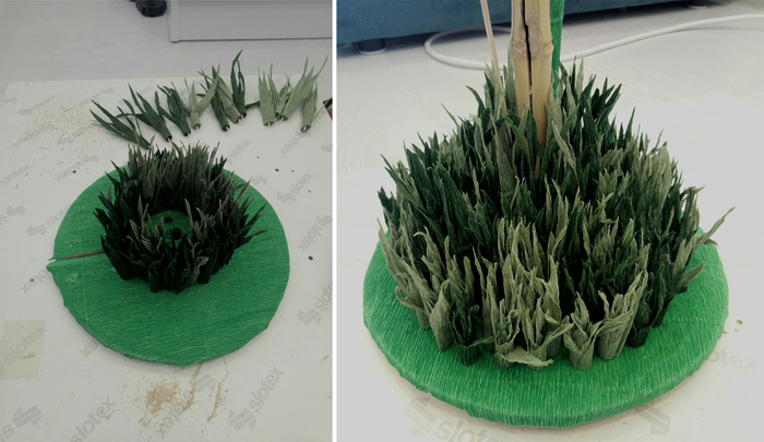 Затем приступил к созданию травы. Ее я делал из гофрированной бумаги, скрепляя ее с зубочистками клеевым пистолетом.