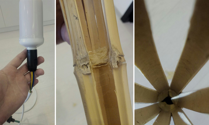 Накрутил лампу, проверил, все работает. Теперь нужно это все вставить в факел. Не знаю, настоящий ли это бамбук или нет, всегда казалось, что внутри он полностью полый. Но тут перемычки оказались заросшими. Пришлось древко расщеплять и ножичком прорезать место для проводов.