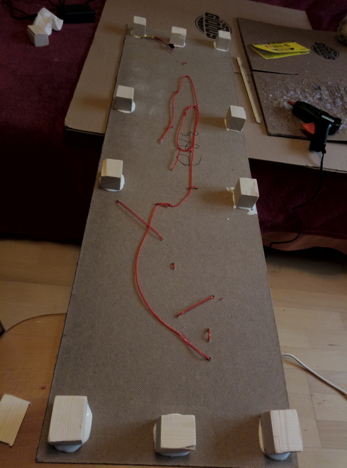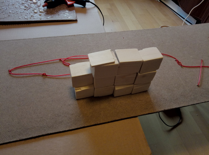 Пришло время клеить брусочки на переднюю панель. Обработав их наждаком и обильно смазав ПВА клеем я разложил бруски в нужных местах. Отдельно уложил три брусочка в том месте, где будет лежать блок питания шнура так, чтобы он был зафиксирован на одном месте.