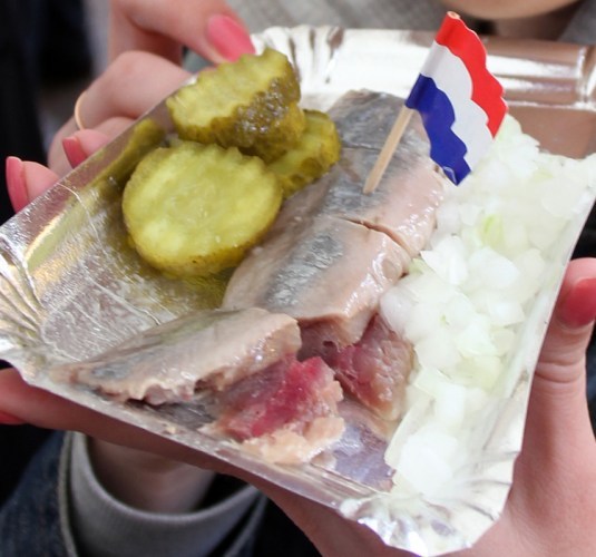 На ярмарке я попробовала трепетно любимую голландцами селедку. Это один из самых популярных видов фастфуда. Она маленькая такая, и солят ее как-то по другому, очень нежная.