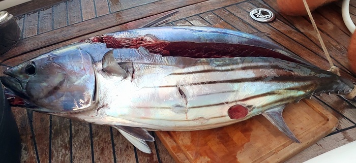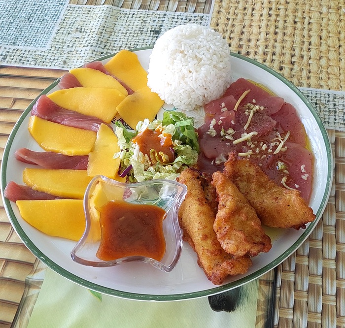 Еда оказалась тоже очееь вкусная, сырой тунец под соусом справа, слева с кусочками манго, а во фритюре махи махи. В общем одной тарелки хватило слихвой на двоих. Стоит 15евро или 1200руб.